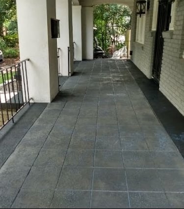 Stamped concrete is decorative concrete patterned to look like stone, brick, or wood.