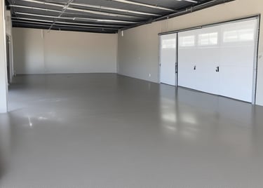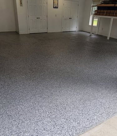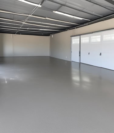 The process involves cleaning and prepping the concrete, applying primer, then layering epoxy resin and topcoat for a smooth finish.